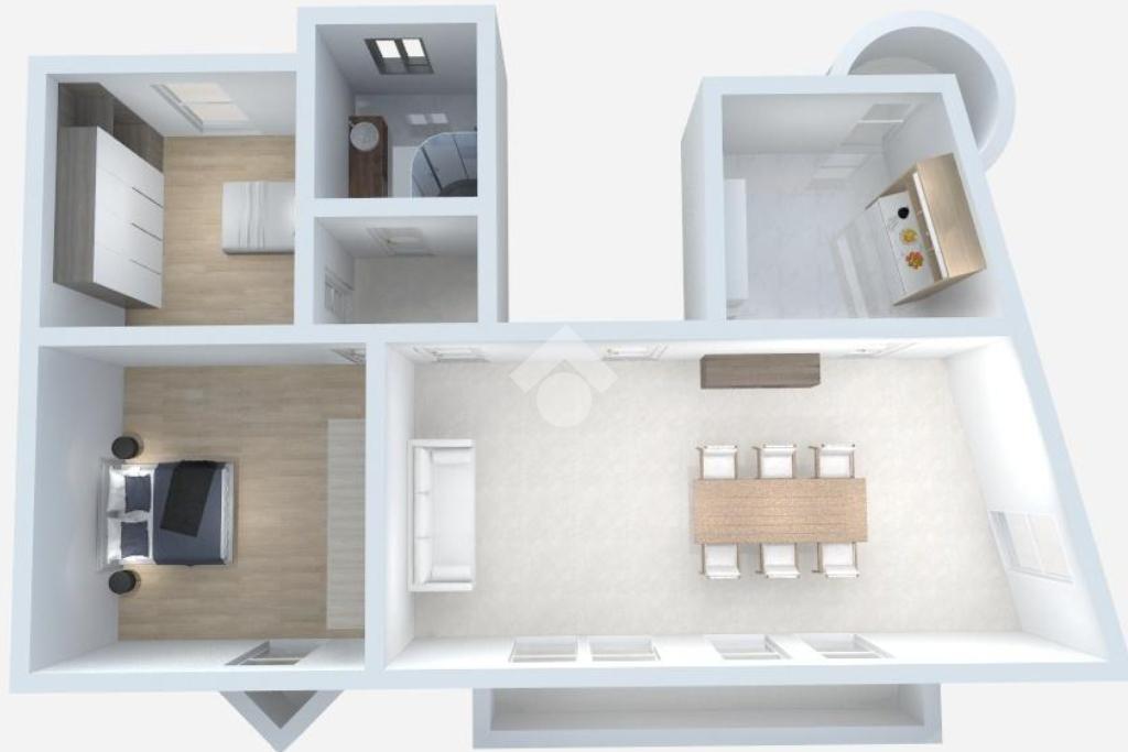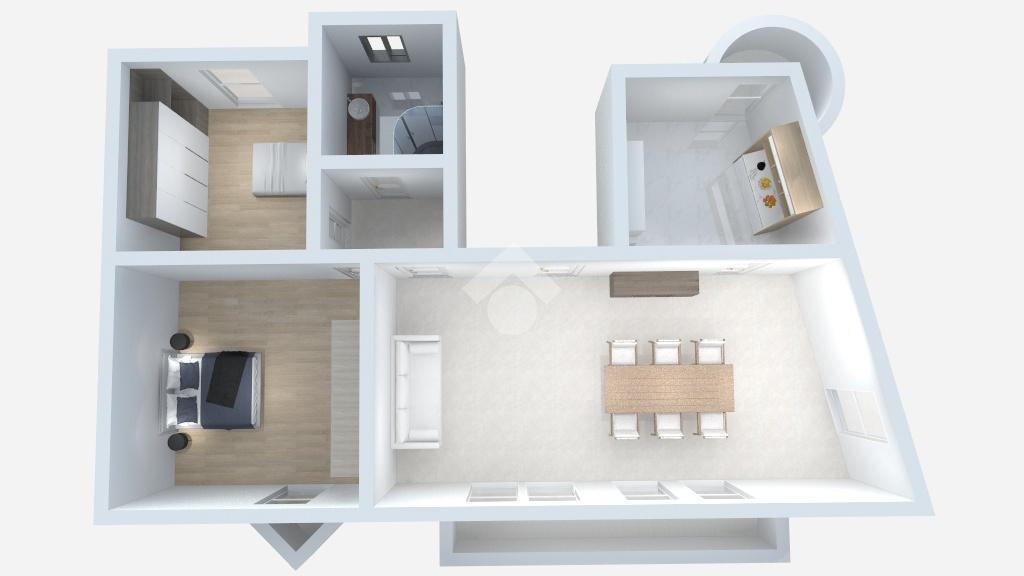 L'immobile si compone di: ingresso su un soggiorno molto spazioso e luminoso grazie ad una intera parete dotata di vetrate, con accesso ad un balcone, cucina abitabile anch'essa con balcone, camera matrimoniale, cameretta e un bagno con doccia e finestra.