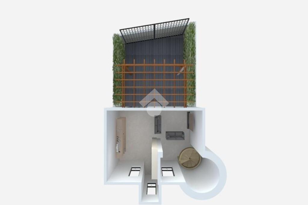La soluzione è così composta: al piano terra troviamo una spaziosa zona giorno con cucina open space dalla quale si accede al giardino piastrellato, ottimo spazio per giornate di relax all'aperto.